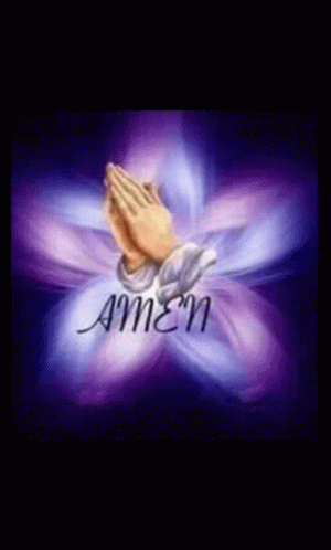 Praying hands over a glowing purple flower with the word "AMEN" written below.