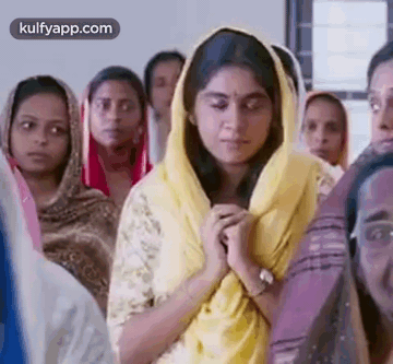 Nimisha Sajayan, wearing a yellow scarf, is seen praying with hands clasped among a group of women.