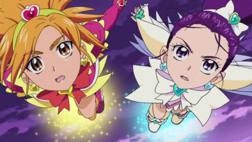 Precure All Stars Dx2 characters, including Cure Blossom and Cure Marine, flying and battling with magic.