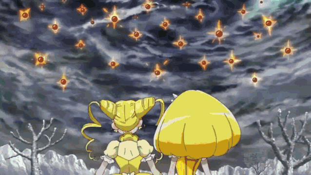 Precure All Stars, including Cure Lemonade and Shiny Luminous, face an attack and launch a powerful rocket.