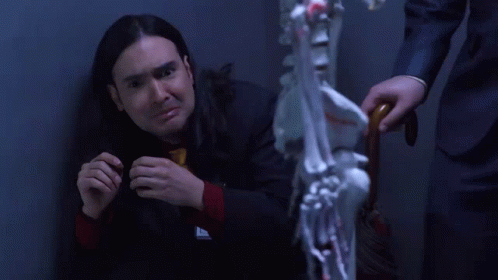 Man from Enchufe Tv with long hair looking scared and worried, cowering behind a wall next to a skeleton.
