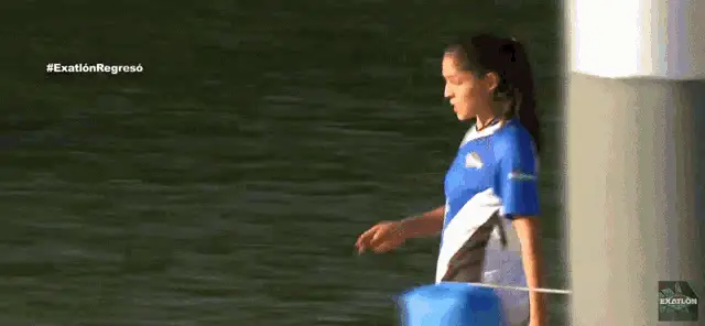 A focused woman from Exatlon, wearing a blue shirt, gestures with a fiery background as scores are displayed.