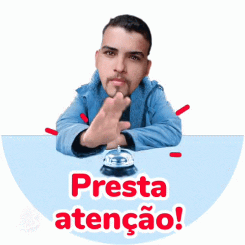 Lucas, wearing a blue jacket, rings a bell with the text 'Presta atenção!' to get your attention.