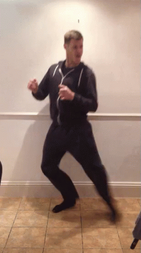 A man in a black hoodie and sweatpants performs an energetic dance routine against a white wall.