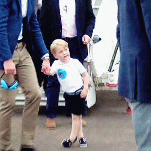 Prince George William, wearing a white shirt, gives a cheerful thumbs up while walking with two men.