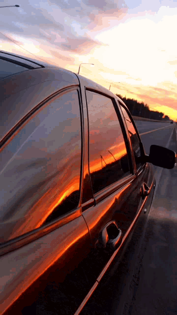 Lada Priora driving on a highway during a beautiful sunset, reflecting vibrant colors of the sky.