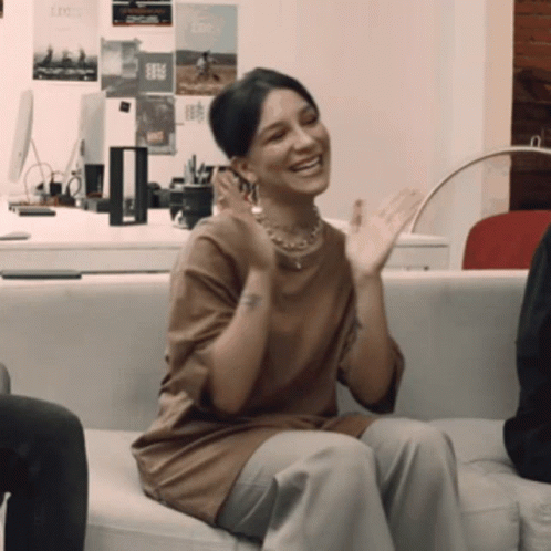 Priscilla Alcântara happily clapping and smiling while sitting on a light-colored couch.