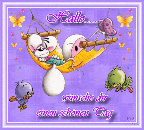 A charming purple greeting card featuring a mouse in a hammock and German text wishing a beautiful day.
