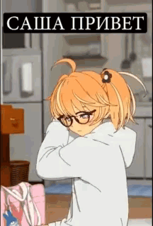 Anime girl Sasha gets ready, putting on her outfit and taking a selfie, with a friendly greeting.
