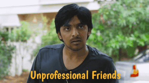 Priyadarshi Tharun looks on with a serious expression, standing in front of a sign for 'Unprofessional Friends'.