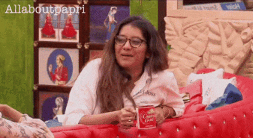Priyanka Deshpande and Pavni Reddy relax on a red couch, enjoying a drink and conversation.