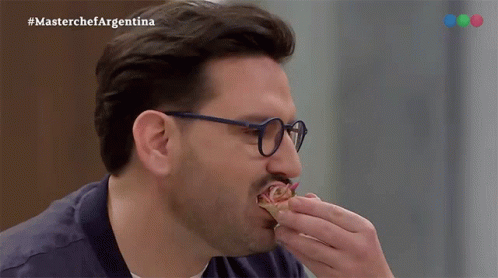 Damián Betular, wearing glasses and a mustache, tastes a dish during Masterchef Argentina.