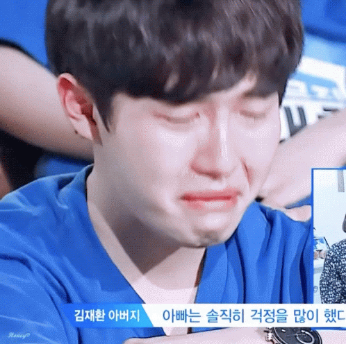 Kim Jaehwan cries emotionally during Produce 101, with a caption from his father expressing worry.