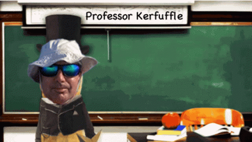 Professor Kerfuffle, a man in a top hat and sunglasses, presents a gold star in front of a chalkboard.