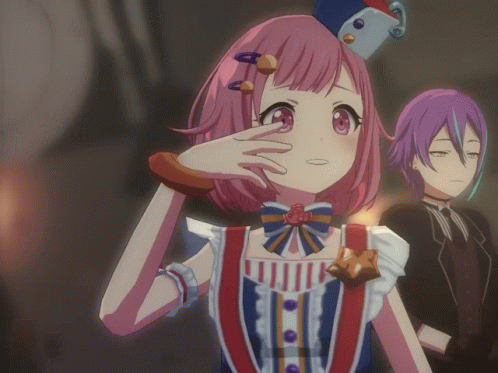 Emu Otori with pink hair in a blue and red outfit, with Rui Kamishiro in the background, from Project Sekai.