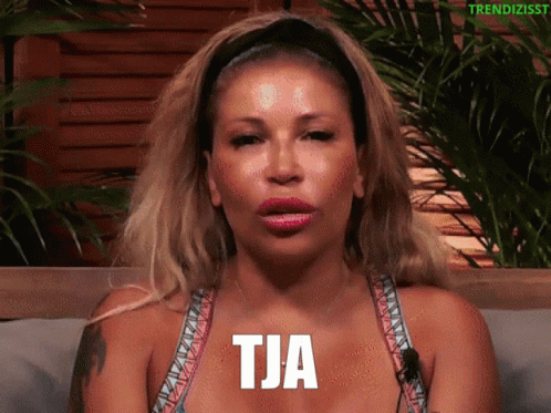 Patricia Blanco's iconic 'Tja' moment from Promis Unter Palmen, expressing resignation or indifference.