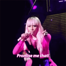 Nicki Minaj on stage, wearing a pink outfit, passionately asking the audience to 'Promise me that!'