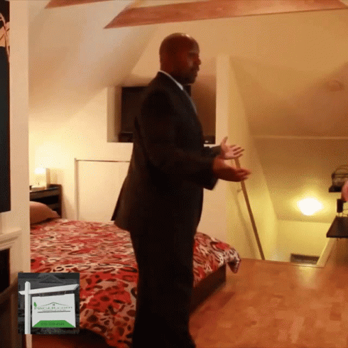 A realtor in a suit shows a bedroom to a potential buyer in a real estate property.