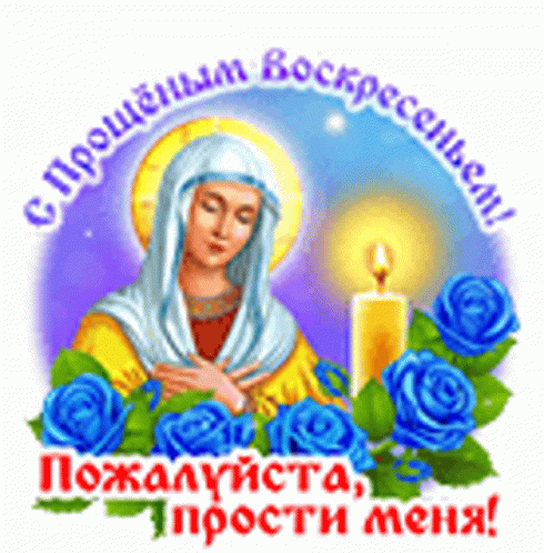 Image of the Mother of God with blue roses and a candle, wishing 'Happy Forgiveness Sunday' and asking for forgiveness.