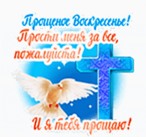 A vibrant animated greeting card for Forgiveness Sunday, featuring a white dove and a blue cross.