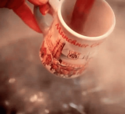 A hand stirs a warm drink in a 'Münchner Kindl' mug, celebrating 'Prost Gluehwein' for Christmas.