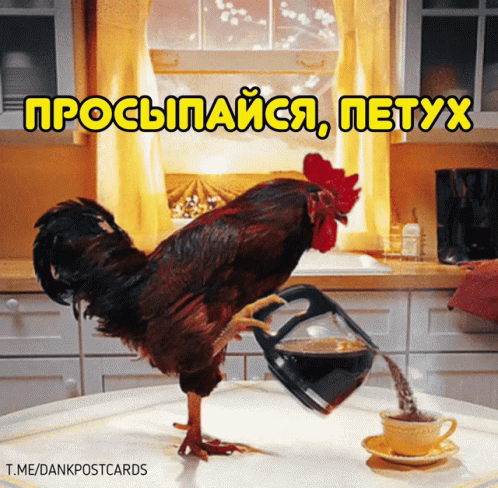 A rooster humorously pours coffee into a cup with the caption 'WAKE UP, ROOSTER'.