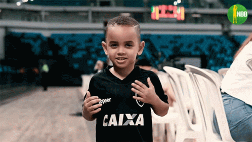 A young boy in a black Botafogo shirt proudly gestures, saying 'Im The Man' in a basketball arena.