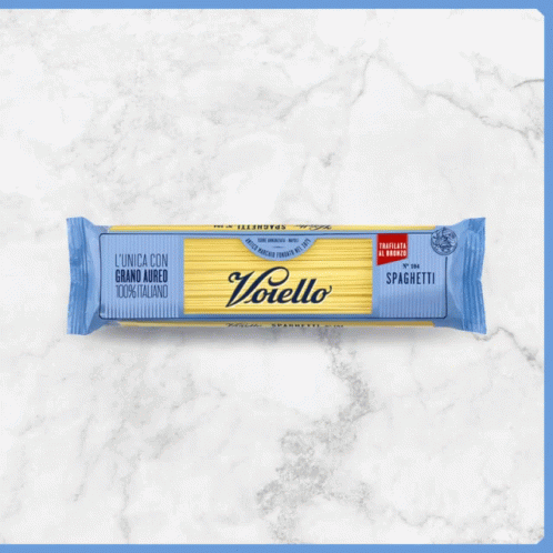 A package of Voiello spaghetti, labeled '100% Italiano', displayed on a marble counter.