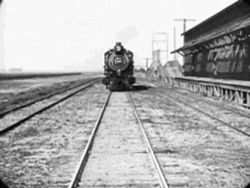 Prps Cos appears on the front of a moving train in this classic black and white footage.