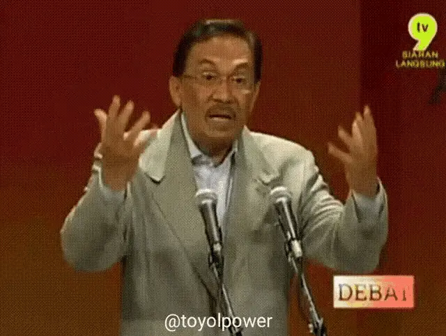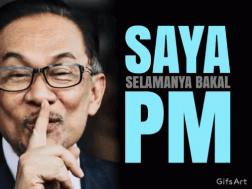 Anwar Ibrahim makes a 'shhh' gesture with the text 'Saya Selamanya Bakal PM' (I am forever the next PM).
