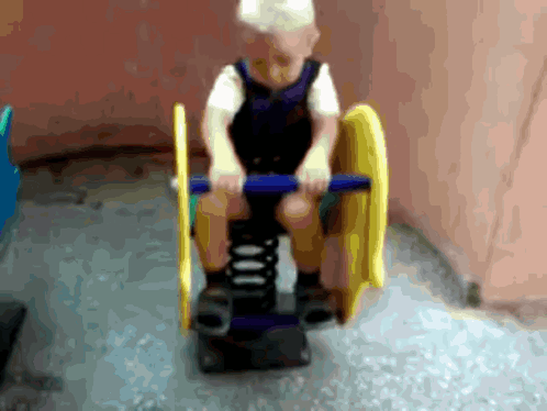 A little boy joyfully bounces on a yellow and blue spring rocking horse at a playground.