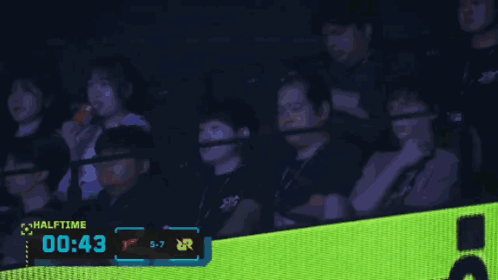 a group of people sitting in a stadium with a halftime display on the screen