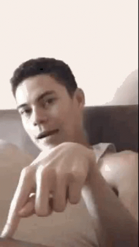 A young man, shirtless and sitting on a bed, looks directly at the camera and points his finger.