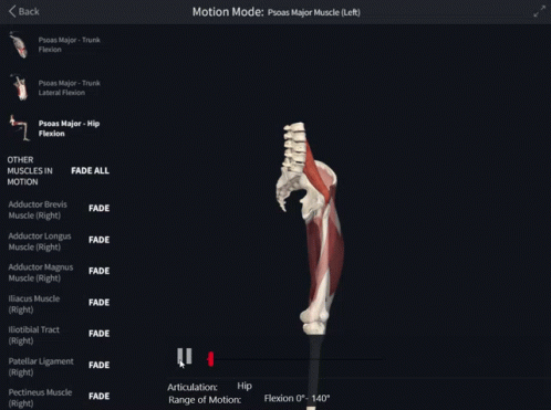 An animated 3D model demonstrates the Psoas Major muscle's role in hip flexion, showing anatomical movement.