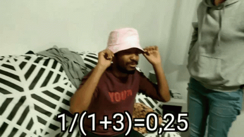 Vahat Chat Che in a pink bucket hat on a couch, gesturing, with a math equation '1/(1+3)=0,25' overlaid. A woman stands nearby.
