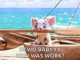 Pua from Moana in a boat on the beach, asking "Hewo Babyyy How Was Work?" with a cute expression.