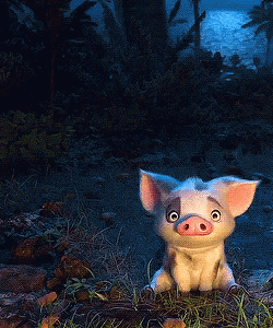 Pua the pig from Disney's Moana sits in a lush forest, looking around with a confused expression.