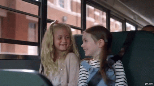 Two happy girls on a school bus, smiling and enjoying their ride, from the Citroen C4cactus commercial.