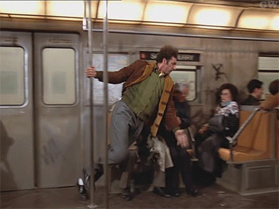 Frasier jumps and dances energetically inside a subway car, surprising other passengers on public transportation.