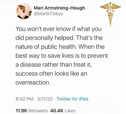 Mari Armstrong-Hough's tweet on public health, pandemics, and how prevention success can look like overreaction.