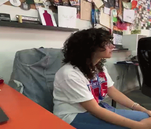 A person with curly hair and glasses makes a sad, pouting face, looking directly at the camera.