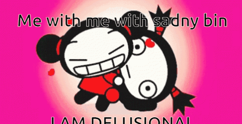 Pucca in a delusional state on a pink background, with text 'me with me with sadny bin' and Sadny Bin.