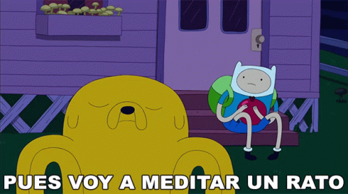 Jake from Adventure Time meditating with Finn sitting nearby, accompanied by the Spanish phrase.