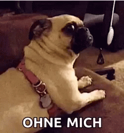 A pug dog on a couch with the German phrase 'Ohne Mich' (Without Me) displayed.