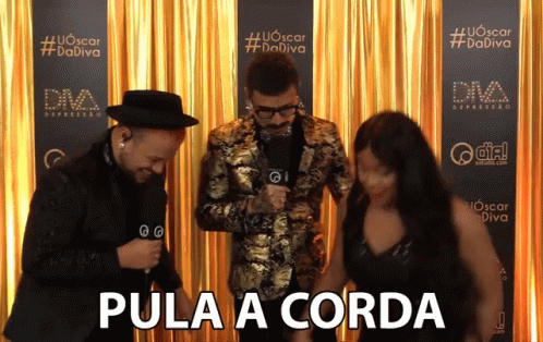 People playfully acting out jumping rope at a Diva Depressão event, with 'Pula A Corda' text visible.