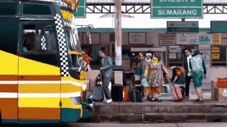 People gather at a bus terminal, ready for their homecoming journey, with a bus marked "Semarang" in the background.