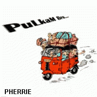Cartoon of an overloaded red auto-rickshaw with people and luggage, representing 'Pulkam' or 'Pulang Kampung'.
