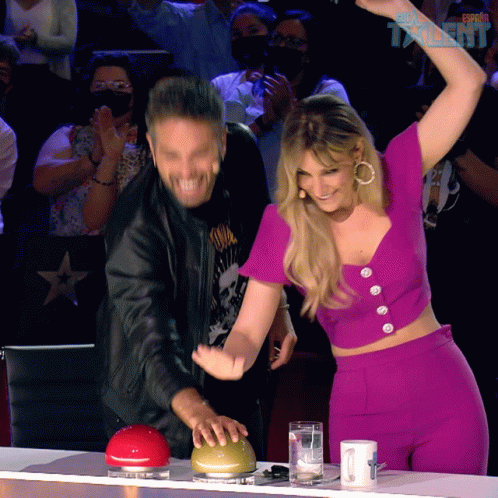 Dani Martínez and a woman celebrate as he presses the Golden Buzzer on Got Talent España, with the audience cheering.