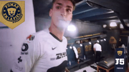 Pumas footballer Juan Ignacio Dinenno smiles and gives a thumbs up in the locker room.