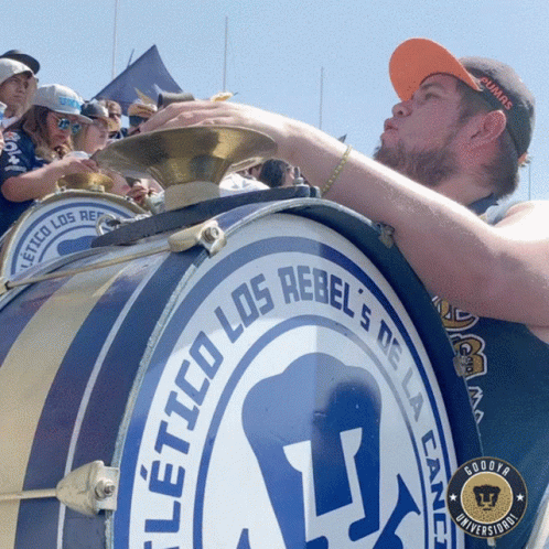 Fan enthusiastically playing a Pumas UNAM drum, featuring 'Los Rebel's' and 'Goya Universidad' branding.